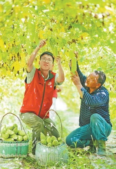 廣西壯族自治區(qū)靈川縣靈田鎮(zhèn)東田村,來(lái)自山東大學(xué)的博士研究生羅雯耀(左)在幫村民采摘。黃勇丹攝(人民視覺(jué))