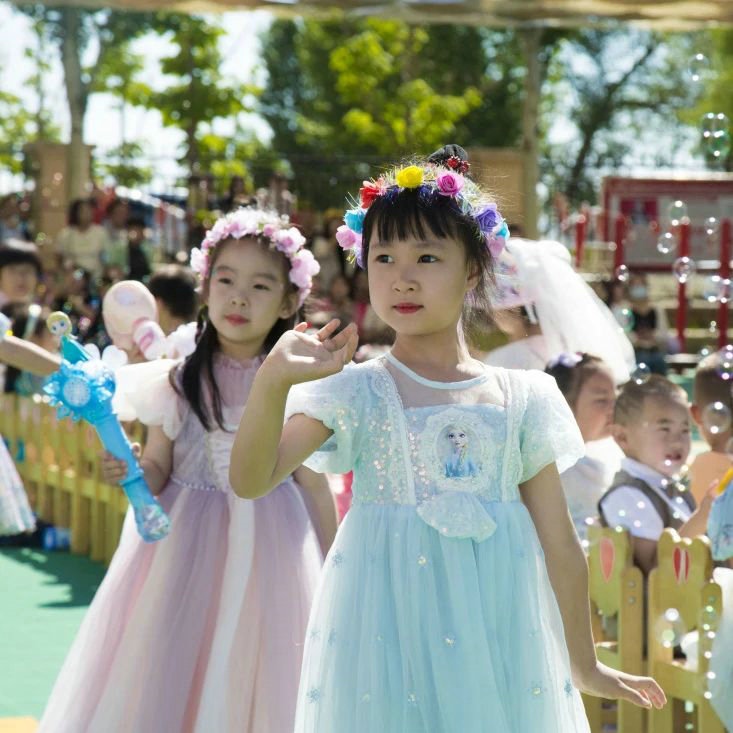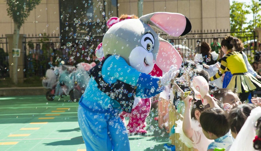 當日,打扮成迪士尼童話里人物的老師們與盛裝打扮的小朋友們,共同手持泡泡機,在晶瑩剔透的泡泡里一起沉浸在童話世界里。