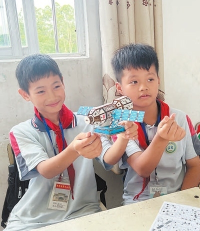 “這是航天衛(wèi)星的兩翼,是安裝太陽能電池板的地方?!眮碜詮V西壯族自治區(qū)梧州市藤縣第五小學(xué)的三年級學(xué)生李杰峰驕傲地展示著親手組裝的模型,他希望將來能從事航天工作。