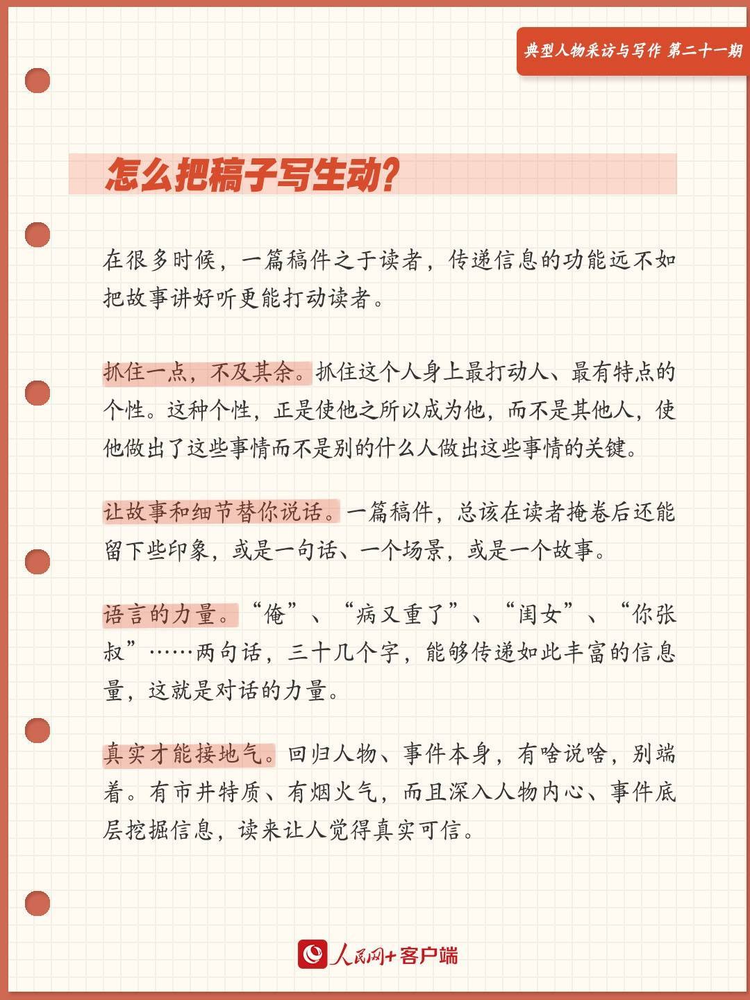 抓住一點,不及其余。副縣長、信訪局長、基層民警、環(huán)衛(wèi)局長……這些被評為“人民滿意的公務員”的采訪對象,每個人身上都有一串光榮事跡,若是有聞必錄,大概寫五六千字也打不住。怎樣在千字內(nèi)把故事講好,讓采訪對象躍然紙上?