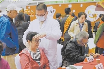 10月10日,2024年北京月壇街道重陽節(jié)為老服務(wù)市集活動在月壇體育館舉行。北京中醫(yī)藥大學(xué)中醫(yī)學(xué)院的志愿者用自己所學(xué)的專業(yè)知識在市集上為老年人服務(wù)。圖為北京中醫(yī)藥大學(xué)中醫(yī)學(xué)院的志愿者在月壇體育館為老人服務(wù)。新華社記者 邢廣利攝