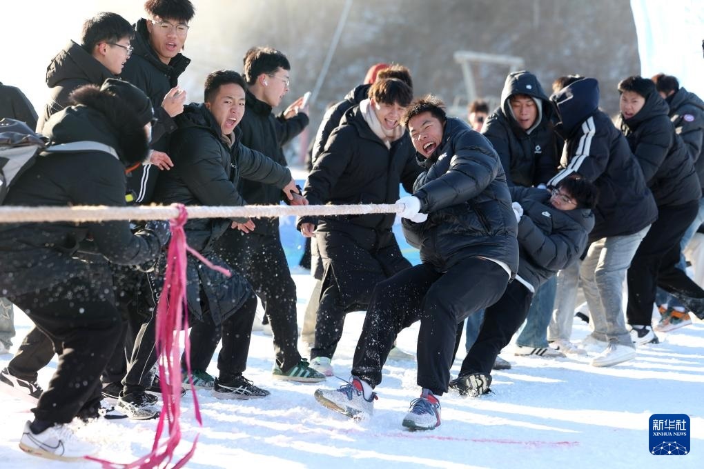 12月21日,在河北省石家莊市鹿泉區(qū)冰雪小鎮(zhèn),大學生進行雪地拔河比賽。