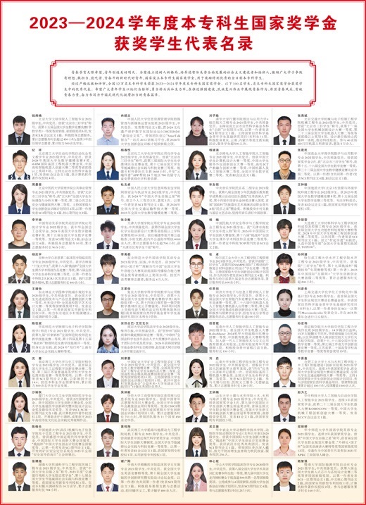 經(jīng)過嚴(yán)格選拔和評審,全國12萬名本??茖W(xué)生榮獲2023—2024學(xué)年度本專科生國家獎學(xué)金。以下100名學(xué)生,是本專科生國家獎學(xué)金獲獎學(xué)生中的優(yōu)秀代表。希望廣大青年學(xué)生以他們?yōu)榘駱?,勇?dāng)排頭兵和生力軍,在推進(jìn)強國建設(shè)、民族復(fù)興偉業(yè)中展現(xiàn)青春作為、彰顯青春風(fēng)采、貢獻(xiàn)青春力量,奮力書寫為中國式現(xiàn)代化挺膺擔(dān)當(dāng)?shù)那啻浩隆?/p>