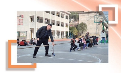 湖南省安化縣南金鄉(xiāng)將軍完小的操場上,龐曉曉(前排左一)組織學(xué)生們開展拔河比賽。