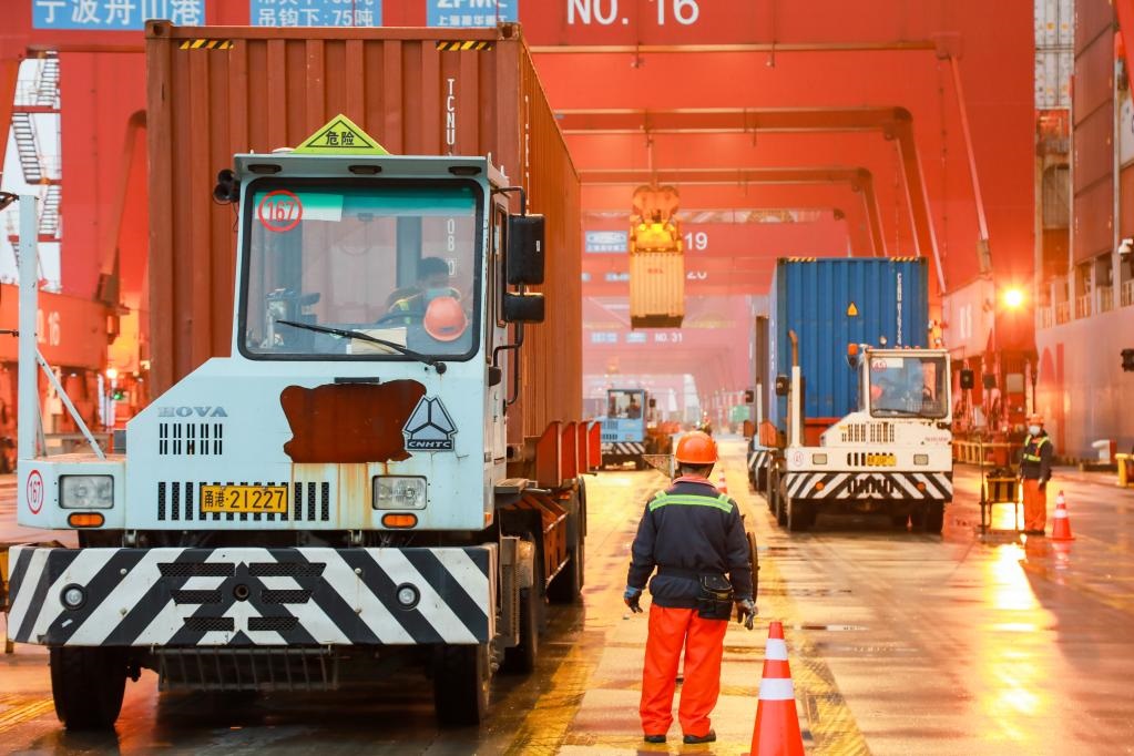 浙江寧波舟山港梅山港區(qū)橋吊在緊張作業(yè)。新華社發(fā)(楊江琦 攝)