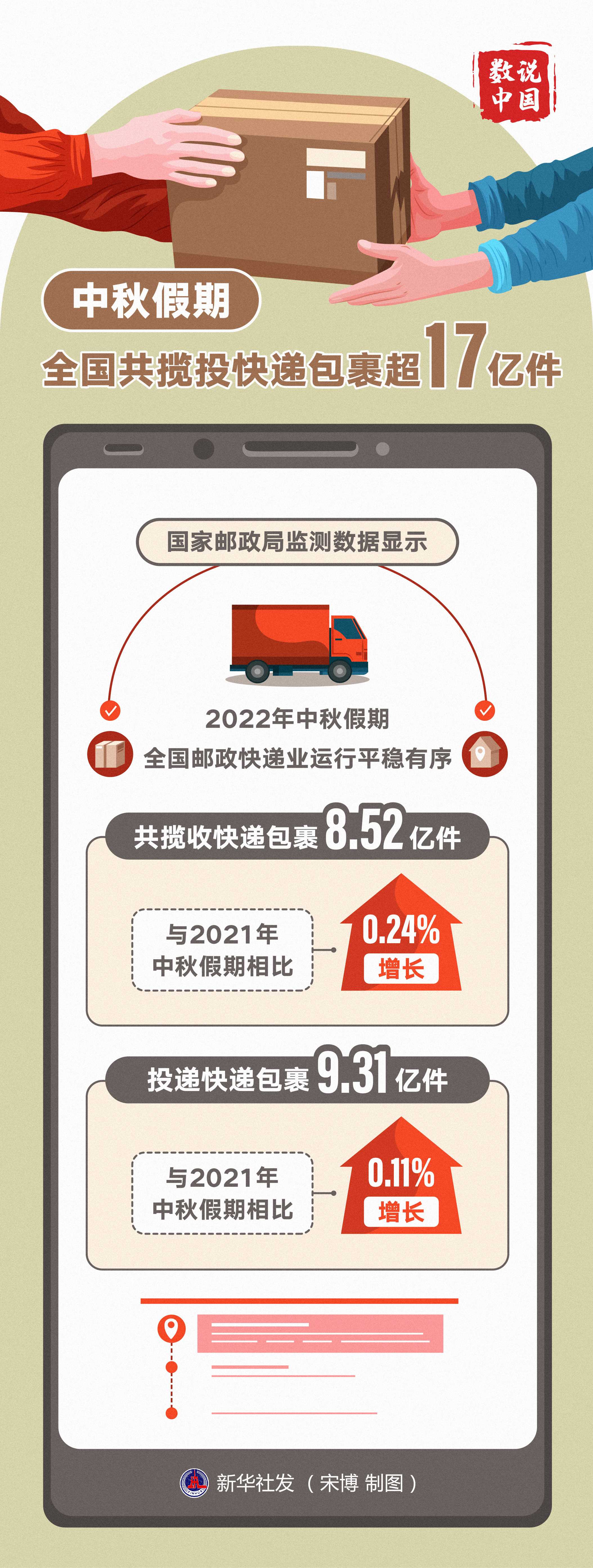 國(guó)家郵政局監(jiān)測(cè)數(shù)據(jù)顯示,2022年中秋假期全國(guó)郵政快遞業(yè)運(yùn)行平穩(wěn)有序,共攬收快遞包裹8.52億件,與2021年中秋假期相比增長(zhǎng)0.24%;投遞快遞包裹9.31億件,與2021年中秋假期相比增長(zhǎng)0.11%。