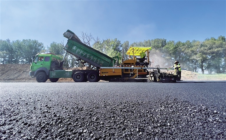 8月5日,施工人員正在鋪設(shè)瀝青。記者從中國二冶集團內(nèi)蒙古分公司和林格爾新區(qū)金盛快速路北段-杭蓋路連接線項目部了解到,該項目正在鋪設(shè)瀝青,同時進行智能交通以及道路交通標(biāo)識標(biāo)線施劃等工作,施工完畢后將于近日通車。該路段通車后,將有效緩解呼和浩特南部城區(qū)出城交通壓力,方便群眾出行。(記者 孟和朝魯 攝)