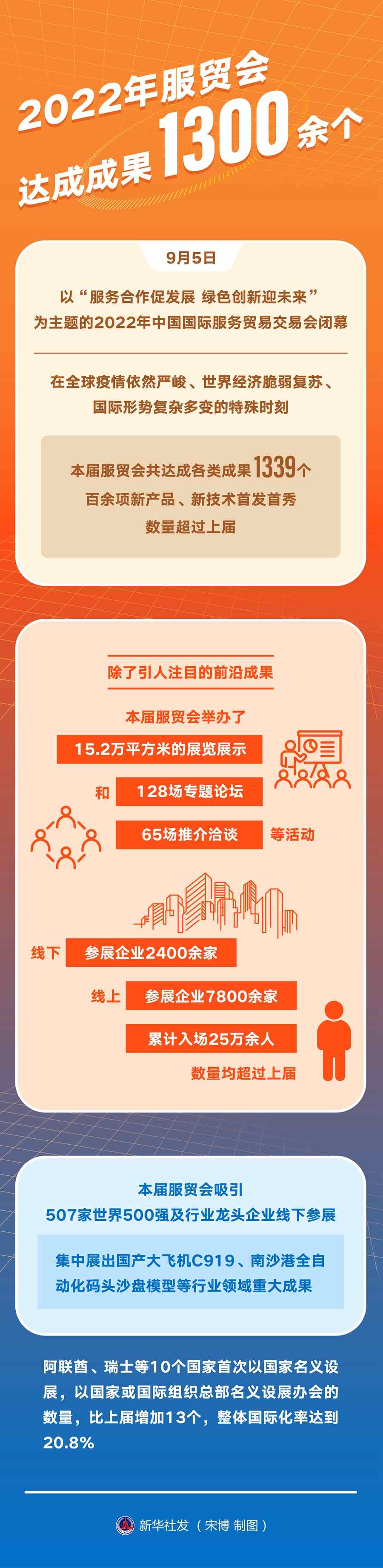 9月5日,以“服務(wù)合作促發(fā)展綠色創(chuàng)新迎未來”為主題的2022年中國國際服務(wù)貿(mào)易交易會閉幕。在全球疫情依然嚴(yán)峻、世界經(jīng)濟(jì)脆弱復(fù)蘇、國際形勢復(fù)雜多變的特殊時刻,本屆服貿(mào)會共達(dá)成各類成果1339個,百余項(xiàng)新產(chǎn)品、新技術(shù)首發(fā)首秀,數(shù)量超過上屆。