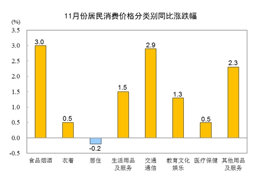 11月份,全國居民消費價格環(huán)比下降0.2%。其中,城市下降0.2%,農(nóng)村下降0.2%;食品價格下降0.8%,非食品價格持平;消費品價格下降0.1%,服務(wù)價格下降0.2%。