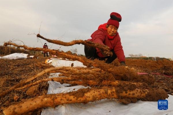 12月12日,溫縣番田鎮(zhèn)余村農(nóng)民在田間收獲鐵棍山藥。新華社發(fā)(徐宏星 攝)