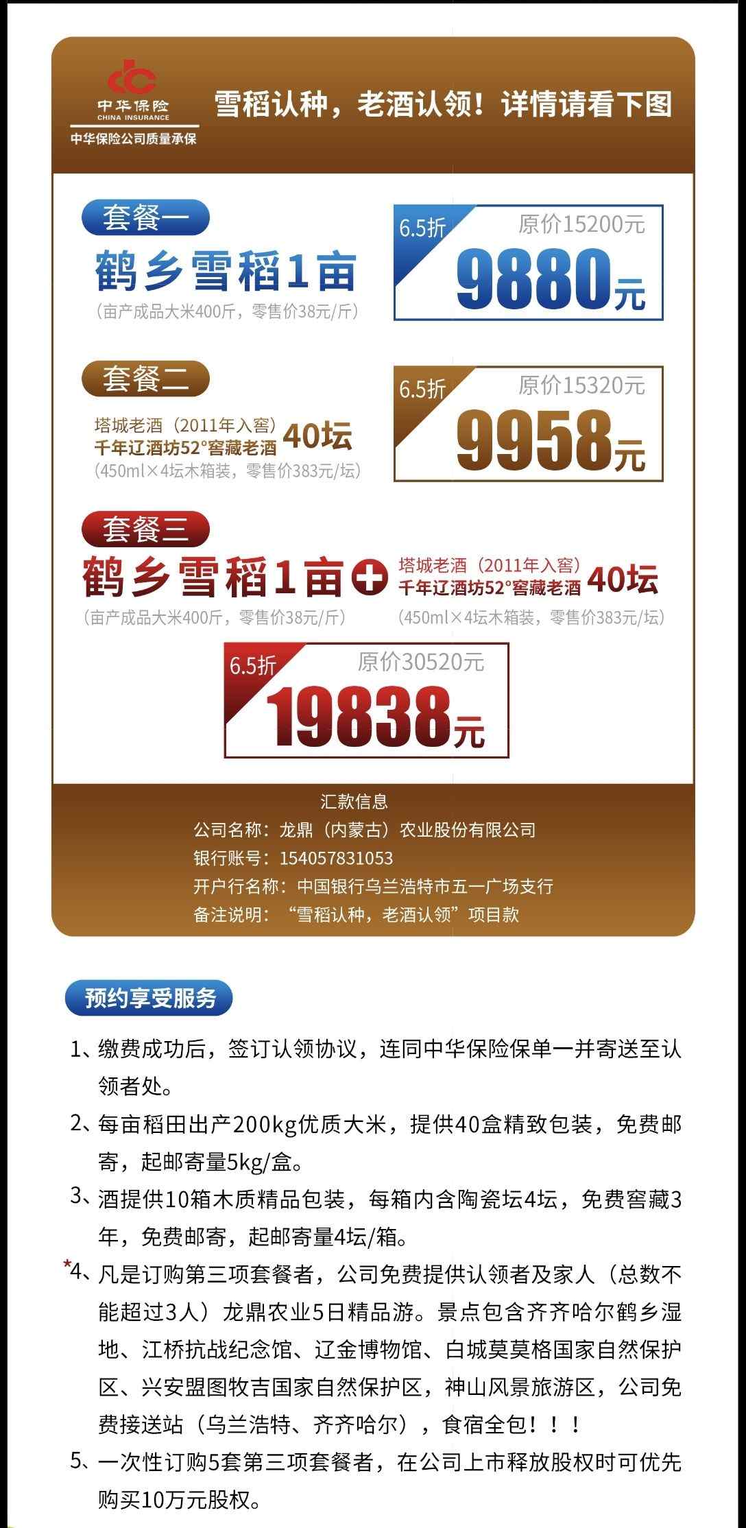 目前,“雪稻認(rèn)種、老酒認(rèn)領(lǐng)”共有三種認(rèn)領(lǐng)套餐(如圖),認(rèn)領(lǐng)第三種套餐,全家可享有龍鼎農(nóng)業(yè)5日深度精品游,景點(diǎn)包含齊齊哈爾鶴鄉(xiāng)濕地、江橋抗戰(zhàn)紀(jì)念館、遼金博物館、白城莫莫格國(guó)家自然保護(hù)區(qū)、興安盟圖牧吉國(guó)家自然保護(hù)區(qū)、神山風(fēng)景旅游區(qū),公司免費(fèi)接送站(烏蘭浩特、齊齊哈爾) ,食宿全包。