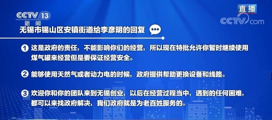 白巖松:首先我們來看看安鎮(zhèn)街道給李彥明的回復當中的一些關鍵詞,第一個,這是政府的責任,不能影響你們的經營。第二個里頭包括能夠使用天然氣或者動力電的時候,政府提供幫助更換設備和線路。在第三里頭有我們政府就是為老百姓服務的。咱們接下來馬上連線一下當事人,無錫市錫山區(qū)安鎮(zhèn)街道商務科的科長鄒祎,就是他幫著辦的這個事情。鄒科長您好!您當然感受得到您火了,在網上也被網友表揚,我特別想知道您的領導表揚您沒有?