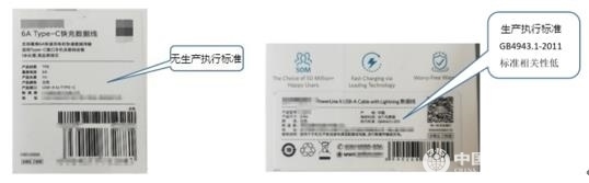 5.46款樣品有36款明示了生產(chǎn)執(zhí)行標(biāo)準,10款未明示生產(chǎn)執(zhí)行標(biāo)準。明示的標(biāo)準絕大多數(shù)為企業(yè)標(biāo)準,少數(shù)為已過時效期的行業(yè)標(biāo)準,或與數(shù)據(jù)線產(chǎn)品無相關(guān)性的安全標(biāo)準。