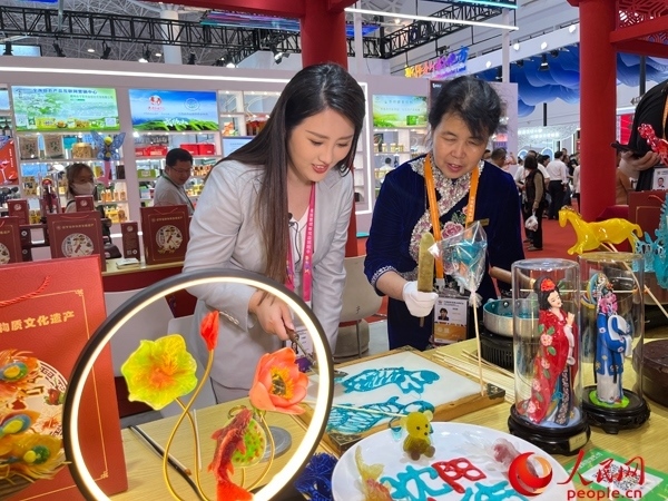 “我們的糖人制作技藝興于清朝道光年間,技法分為吹、塑、畫。結(jié)合消費(fèi)新需求,我們推出了一些新產(chǎn)品,很受年輕人喜歡。在消博會(huì)上,通過(guò)展示糖人技藝,讓更多的消費(fèi)者了解傳統(tǒng)文化,喜歡上我們的作品。”沈陽(yáng)李氏糖人制作技藝第五代傳承人李鳳艷表示。