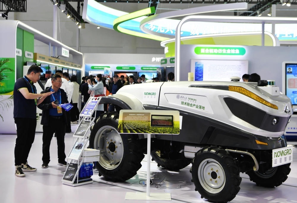 在第六屆數(shù)字中國建設(shè)峰會智慧農(nóng)業(yè)展廳展出的新能源無人駕駛智能拖拉機(jī)吸引參觀者駐足觀看(4月26日攝)。新華社記者 魏培全 攝