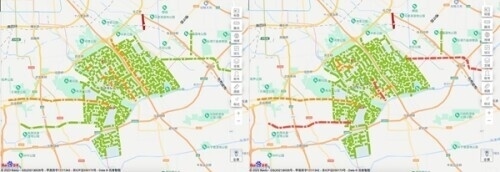 受五一假期及暴雨天氣影響,4月28日晚北京全市(六環(huán)內(nèi)除右下角亦莊區(qū)域)內(nèi)交通面臨嚴(yán)重?fù)矶?,高峰城市擁堵指?shù)暴增2.5倍,路網(wǎng)路況全面飄紅。對(duì)比4月21日參照路況可以看出,4月28日晚高峰,整體擁堵指數(shù)更是一度到達(dá)3.6以上。