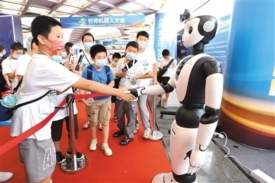 在北京亦創(chuàng)國(guó)際會(huì)展中心舉行的2022世界機(jī)器人博覽會(huì)上,小觀(guān)眾在與智能服務(wù)機(jī)器人握手。陳曉根攝(人民視覺(jué))