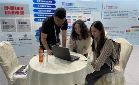 萬方數(shù)據(jù)工作人員現(xiàn)場(chǎng)為用戶進(jìn)行產(chǎn)品演示。(受訪者供圖)