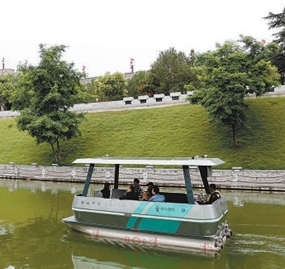 游客在西安護(hù)城河乘坐自動駕駛游船游覽。 本報記者 原韜雄攝