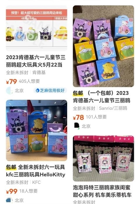 在某二手平臺,肯德基此次發(fā)售的三麗鷗玩具,標(biāo)價集中在70元至100元之間,比69.9元的兒童節(jié)套餐價格更貴。麥當(dāng)勞俄羅斯方塊游戲機(jī)的價格多在40元至60元之間。