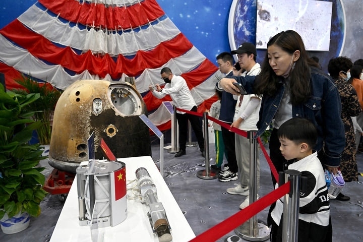 觀眾在安徽合肥舉辦的以“走向世界的中國航天”為主題的展覽上參觀嫦娥五號返回器等實物展品(2023年4月24日攝)。新華社記者 黃博涵 攝