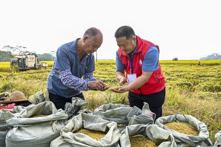 在廣西興業(yè)縣石南鎮(zhèn)鳳山村的稻田里,科技特派員(右)在查看晚稻品質(2022年11月10日攝)。新華社記者 曹祎銘 攝