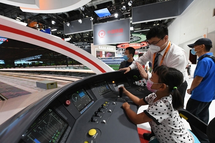 小朋友在2022年中國國際服務貿(mào)易交易會國家會議中心展館體驗京張高鐵動車組模擬駕駛臺(2022年9月3日攝)。新華社記者 任超 攝