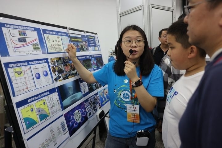 在中科院物理研究所超導國家重點實驗室,志愿者在向參觀者普及超導知識(2023年5月13日攝)。新華社記者 金立旺 攝