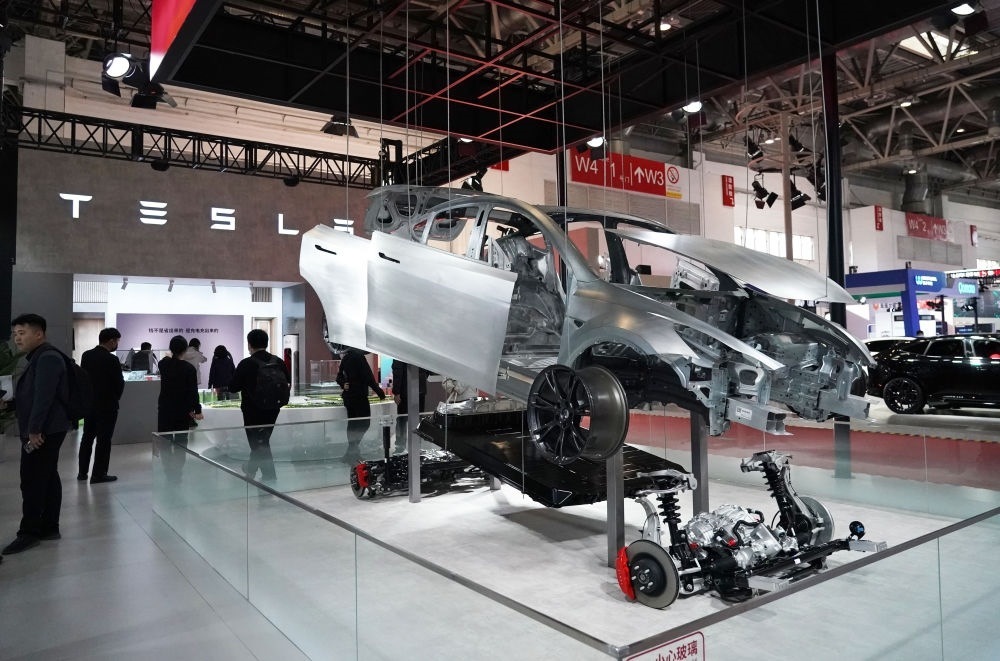 這是在首屆中國國際供應鏈促進博覽會現(xiàn)場拍攝的特斯拉展位(2023年11月30日攝)。新華社記者 任超 攝