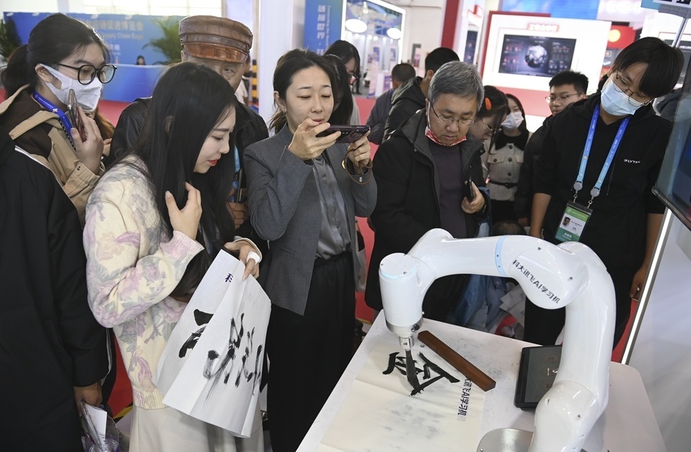 參觀者在首屆中國國際供應鏈促進博覽會數(shù)字科技鏈展區(qū)科大訊飛展位觀看一款AI書法機器人寫毛筆字(2023年12月2日攝)。新華社記者 蔡湘鑫 攝