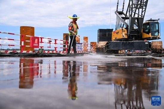 6月21日,中鐵建大橋局施工人員為萬龍大橋主墩樁基作業(yè)平臺澆水降溫。