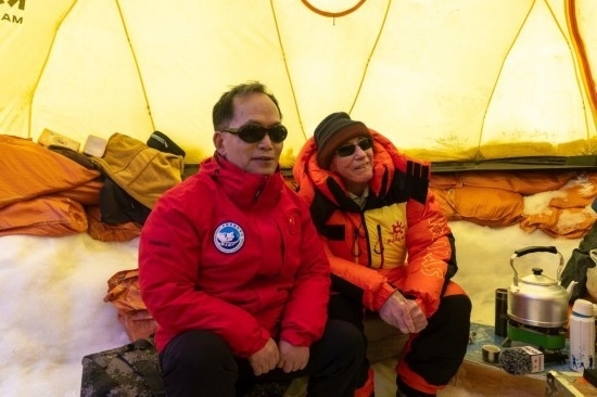 姚檀棟(左)、湯普森在普若崗日冰原10號(hào)冰川冰穹C作業(yè)點(diǎn)工作帳篷內(nèi)查看作業(yè)情況時(shí)合影。新華社記者姜帆 攝