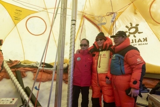 姚檀棟、湯普森在海拔5400米的普若崗日冰原科考主營(yíng)地與部分科考隊(duì)員合影。新華社記者劉詩(shī)平 攝
