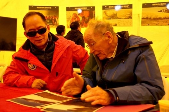 湯普森(右)、姚檀棟(左)在察看普若崗日冰原6號(hào)冰川冰穹A作業(yè)點(diǎn)返回營(yíng)地后討論冰芯鉆取情況。新華社記者劉詩(shī)平 攝