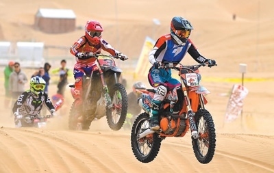 戶外運動愛好者在內(nèi)蒙古鄂爾多斯市杭錦旗參加摩托車沙漠越野場地賽。王 正攝(人民視覺)