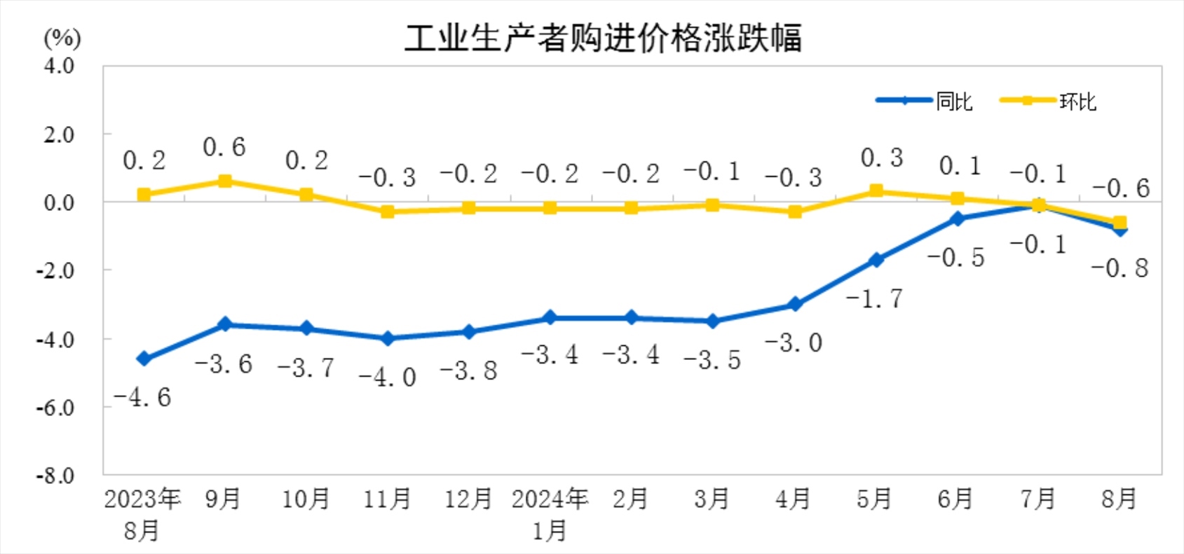 2024年8月份,全國工業(yè)生產(chǎn)者出廠價格同比下降1.8%,環(huán)比下降0.7%;工業(yè)生產(chǎn)者購進價格同比下降0.8%,環(huán)比下降0.6%。1—8月平均,工業(yè)生產(chǎn)者出廠價格比上年同期下降1.9%,工業(yè)生產(chǎn)者購進價格下降2.1%。