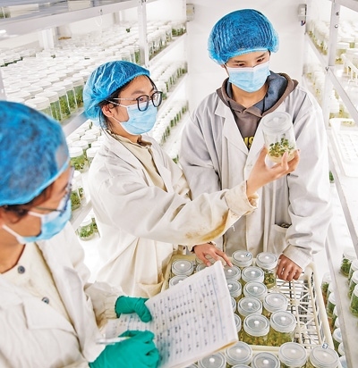 河南商丘睢縣城關(guān)鎮(zhèn)袁莊村,工作人員在實(shí)驗室內(nèi)查看草莓組培苗生長情況。