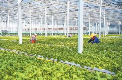 江蘇宿遷經(jīng)濟(jì)技術(shù)開發(fā)區(qū)南蔡數(shù)字農(nóng)業(yè)產(chǎn)業(yè)園溫室大棚里,村民在對蔬菜秧苗進(jìn)行管護(hù)作業(yè)。