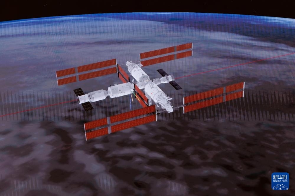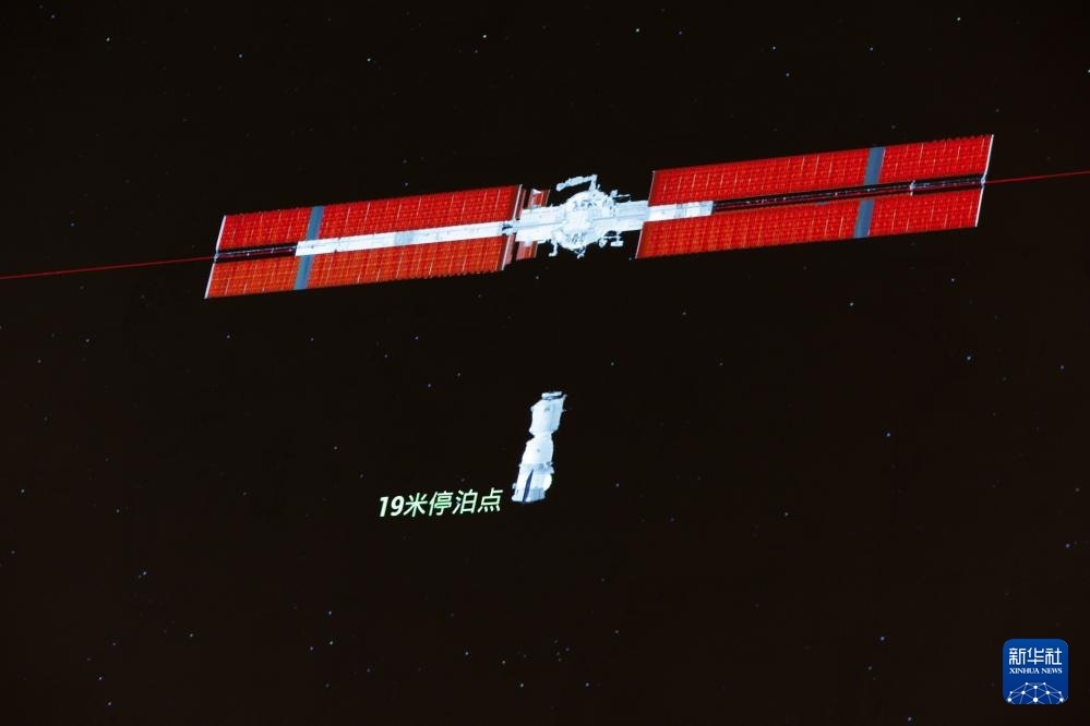 4月24日在北京航天飛行控制中心拍攝的神舟二十號載人飛船對接空間站天和核心艙過程的模擬畫面。新華社記者 金立旺 攝