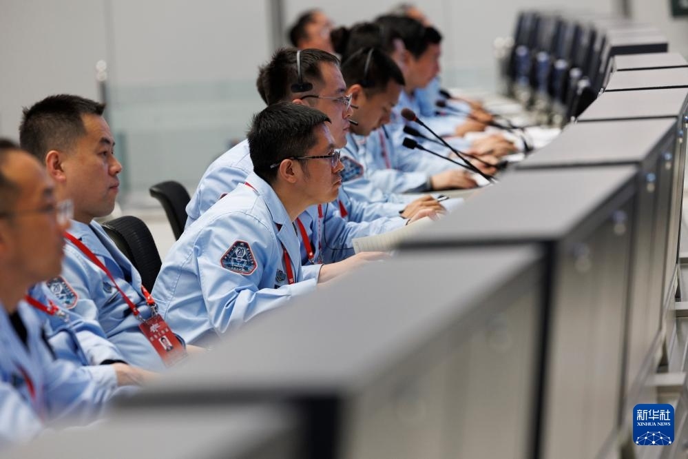 4月24日在北京航天飛行控制中心拍攝的神舟二十號載人飛船成功對接空間站天和核心艙畫面。新華社記者 金立旺 攝