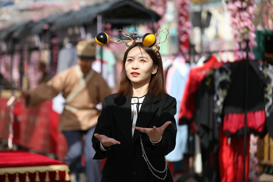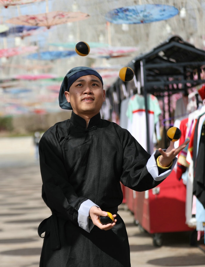 園區(qū)昔日的觀景臺(tái),今日變身“迎春路”,花團(tuán)錦簇的搖椅,五顏六色的油紙傘,身著古典裝扮的演員,精彩絕倫的雜技表演,吸引著游客艷羨的目光,引來(lái)陣陣歡呼。蹴鞠、投壺等民俗互動(dòng)游戲讓游客參與其中,各色美食,令人大快朵頤,“迎春路”上春光燦爛,儼然一片歡樂(lè)的海洋。