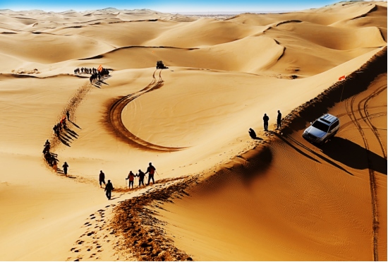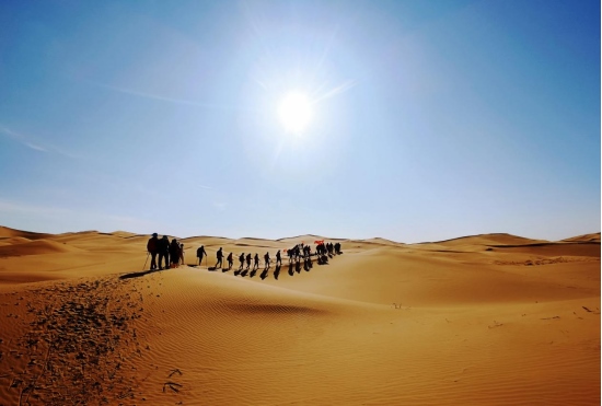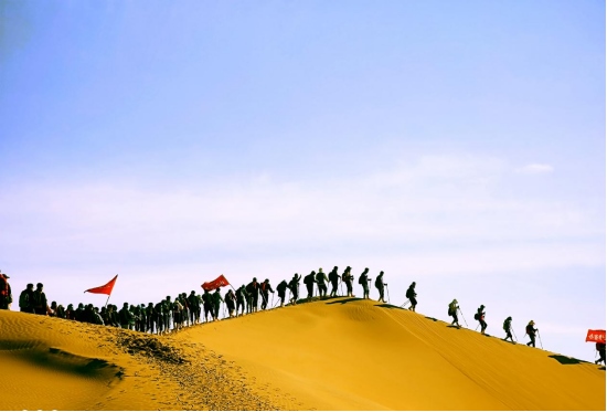 4月8日,內蒙古鄂爾多斯杭錦旗境內的庫布其沙漠,一隊游客正在沙漠中穿沙。