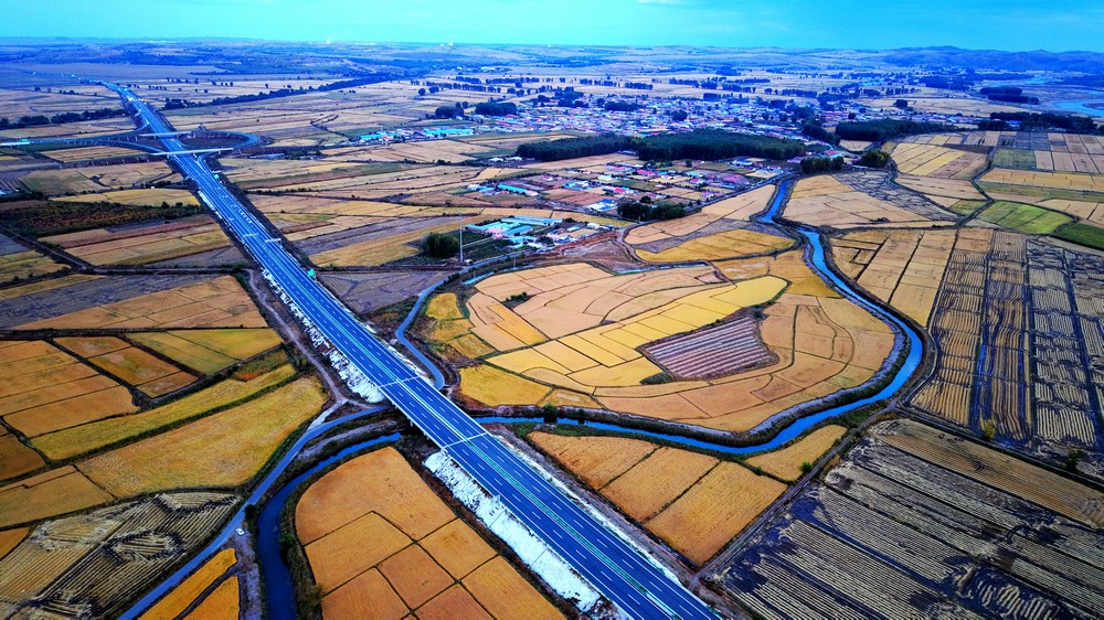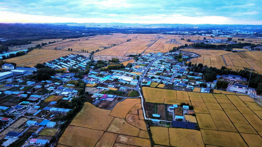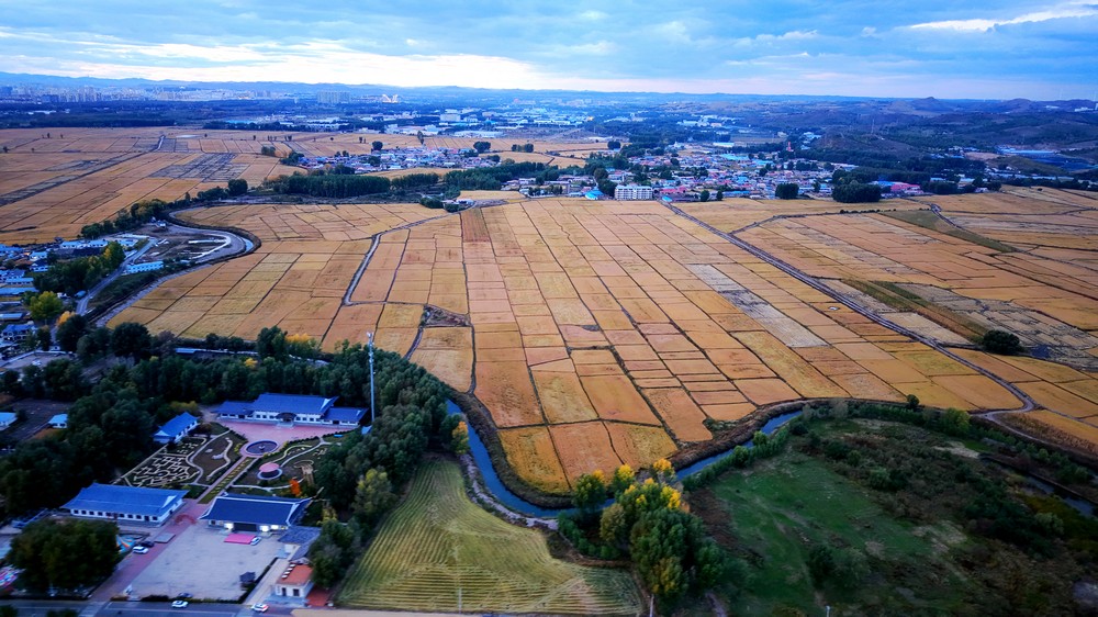 9月25日,空中俯瞰暮色中的三合村,遠(yuǎn)山如黛,稻田如畫(huà),金色的麥浪,映襯著豐收的底色。
