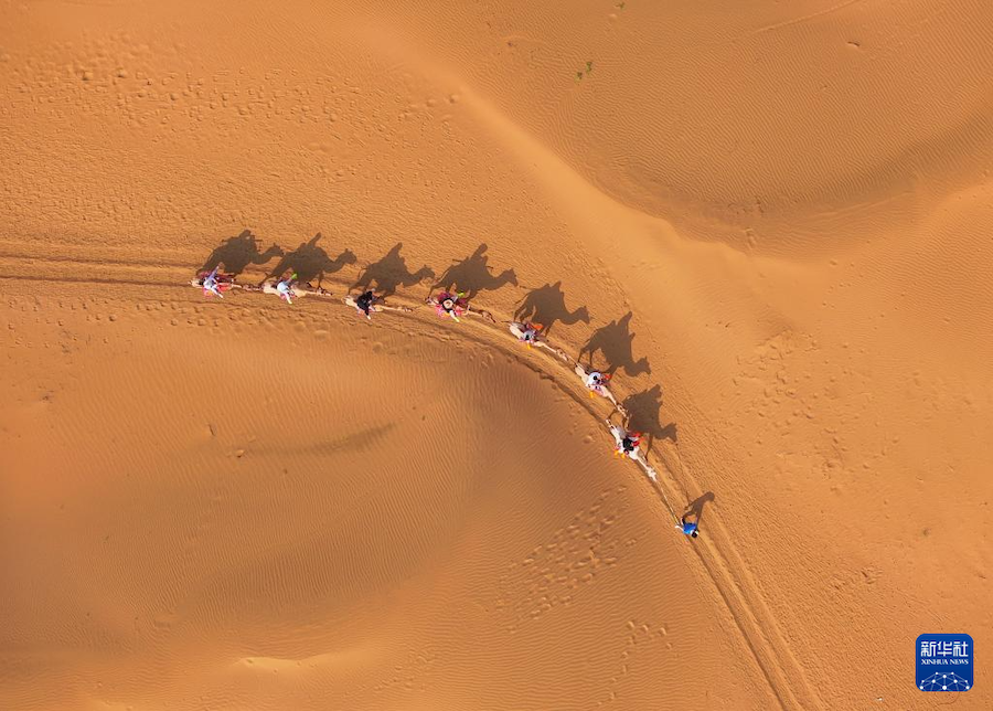 8月1日,游客在達(dá)拉特旗銀肯塔拉沙漠景區(qū)騎駱駝(無(wú)人機(jī)照片)。
