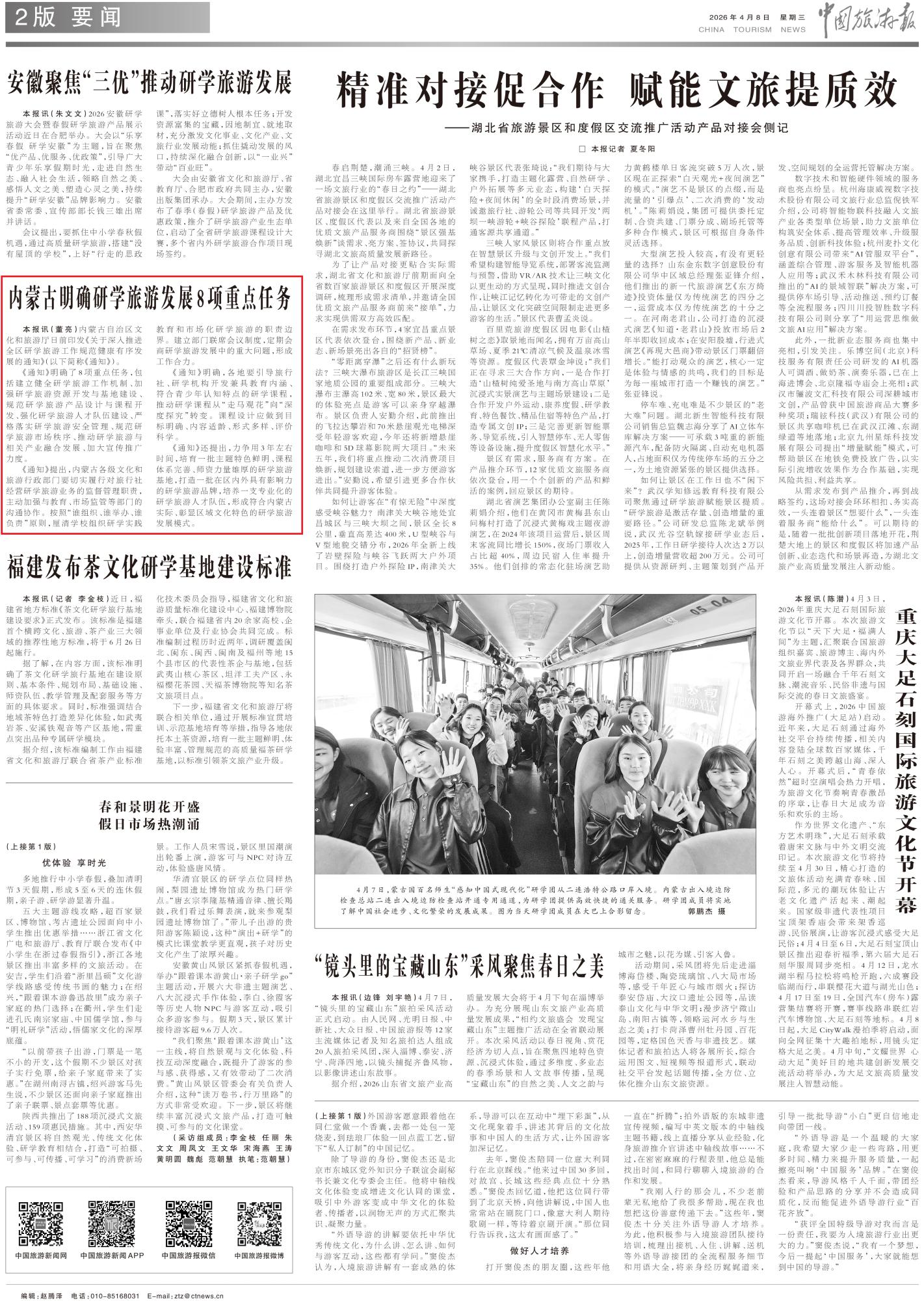 2026年4月8日《中國旅游報》2版刊發(fā)題為《內(nèi)蒙古明確研學旅游發(fā)展8項重點任務(wù)》的文章,報道了內(nèi)蒙古自治區(qū)文化和旅游廳日前印發(fā)《關(guān)于深入推進全區(qū)研學旅游工作規(guī)范健康有序發(fā)展的通知》明確了8項重點任務(wù),包括建立健全研學旅游工作機制、加強研學旅游資源開發(fā)與基地建設(shè)等。