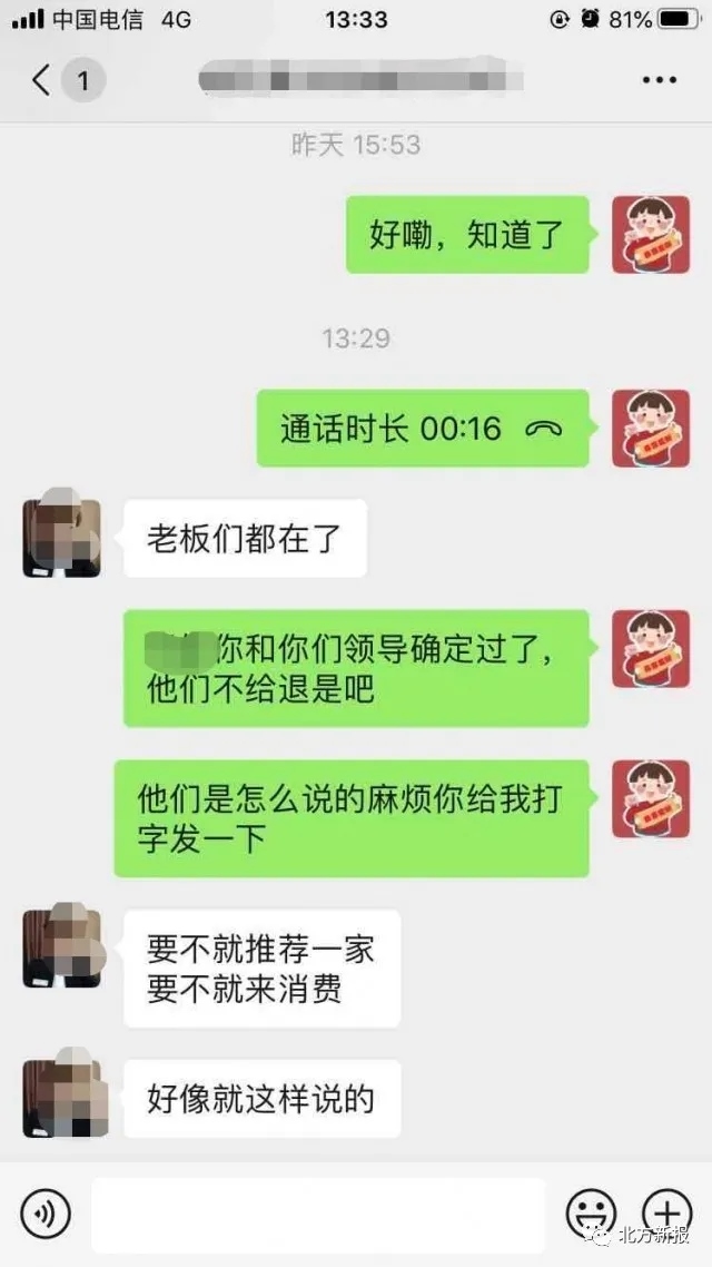 高先生提供給記者的一份微信聊天記錄顯示,當(dāng)高先生提出退還押金的要求時(shí),白泉山莊海世盛宴的工作人員告知,要不就推薦其他人到這里舉辦婚禮,要不就來這里消費(fèi)以抵消押金。總之,押金是不能退的。