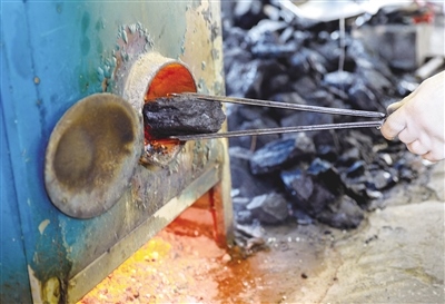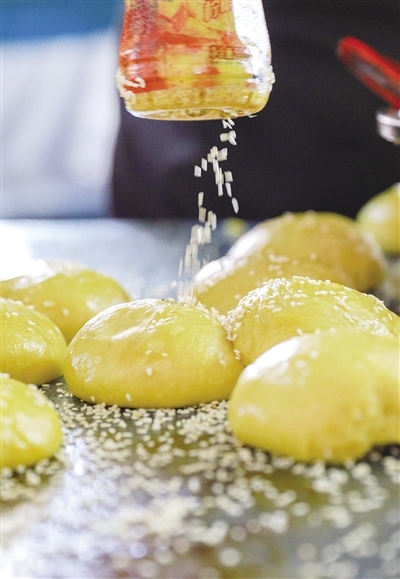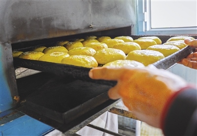 “我們堅(jiān)持手工制作,就是想留住這個(gè)味道!”常三文是隆盛莊月餅制作技藝非遺傳承人,他帶記者來(lái)到了打月餅的作坊。一個(gè)約60平方米的房間里有兩個(gè)大鐵鍋,一個(gè)鐵鍋里熬著糖水,另一個(gè)鐵鍋用來(lái)和面。一名男工將面粉、熟胡麻油、糖水等按比例倒入鐵鍋,然后用鐵鏟攪拌起來(lái)。鐵鍋旁邊是一個(gè)做月餅的大案板,4個(gè)女工稱重、分劑、做胚、擺放,各自忙活著。常三文的兒子常曉峰負(fù)責(zé)將擺放好的月餅放進(jìn)燒爐火的烤爐,計(jì)時(shí)、下簽子、刷油……直至月餅烤制完成出爐。