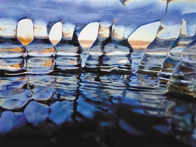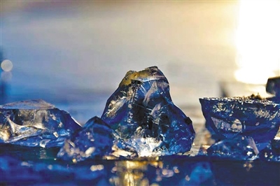 冰塊在夕陽霞光的照耀下,變身冬日瑪瑙,晶瑩剔透,溢光流彩。潔凈的冰面像龜背一樣裂出美麗的紋理,與夜晚琥珀色的天空相映成趣,令人眩目,美妙無比?!∴崗V鑫 攝
