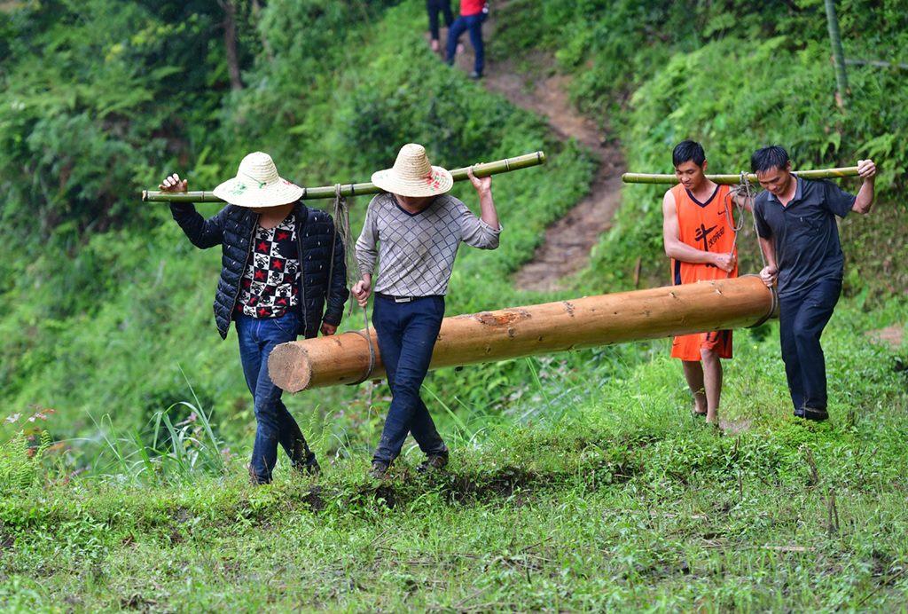 在黔桂烏英苗寨,群眾在抬木頭,準(zhǔn)備建新木樓(2019年6月1日攝)。