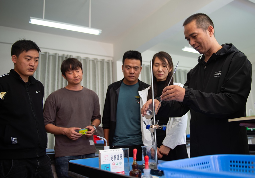 北京市援青支教教師、來自通州區(qū)陸辛莊學(xué)校的化學(xué)教師祁生貴(右一)在青海省玉樹州第四民族高級中學(xué)指導(dǎo)學(xué)校教師進(jìn)行實(shí)驗(yàn)教學(xué)(2020年8月12日攝)。新華社記者 陳鐘昊 攝